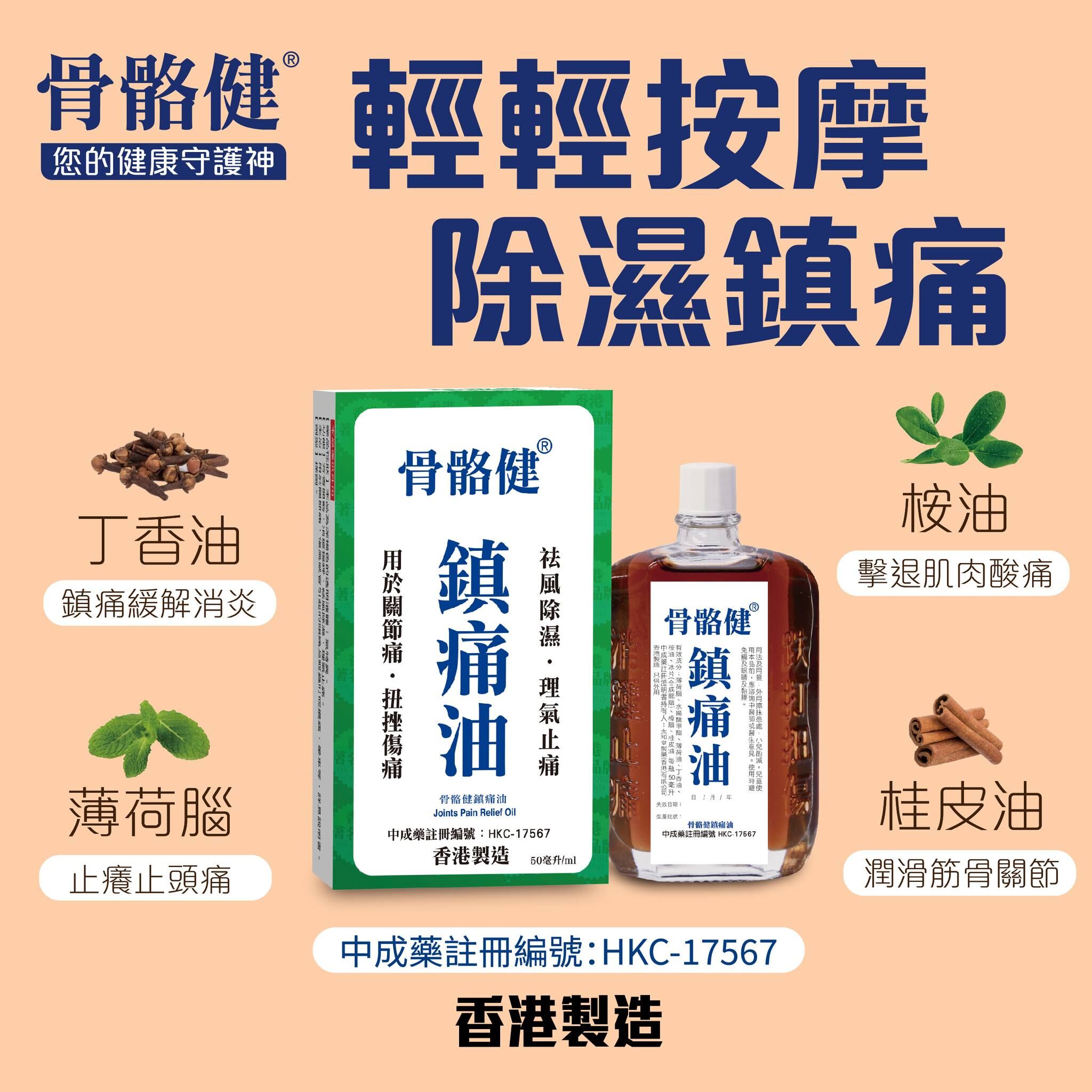 從中醫角度,運動後的肌肉酸痛,往往是因為氣血運行不暢、肌肉緊張所致。骨骼健鎮痛油內含丁香、桂皮、桉油等多種優質天然鎮痛中藥成分。只需要輕輕按摩,有助紓緩運動後帶來嘅肌肉痛楚,以及立即紓緩肩頸痛、腰背痛等多種痛症,即時見效,趕走痛楚!