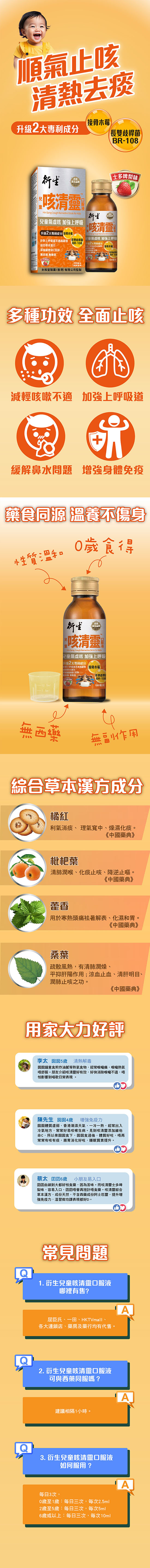 衍生兒童咳清靈口服液,針對兒童上呼吸道不適而研發,精選10款藥食同源清肺止咳的草本提取物,另添專利成份:接骨木莓和長雙歧桿菌BR-108,成份天然不含西藥,有助兒童清熱化痰、理氣止咳。