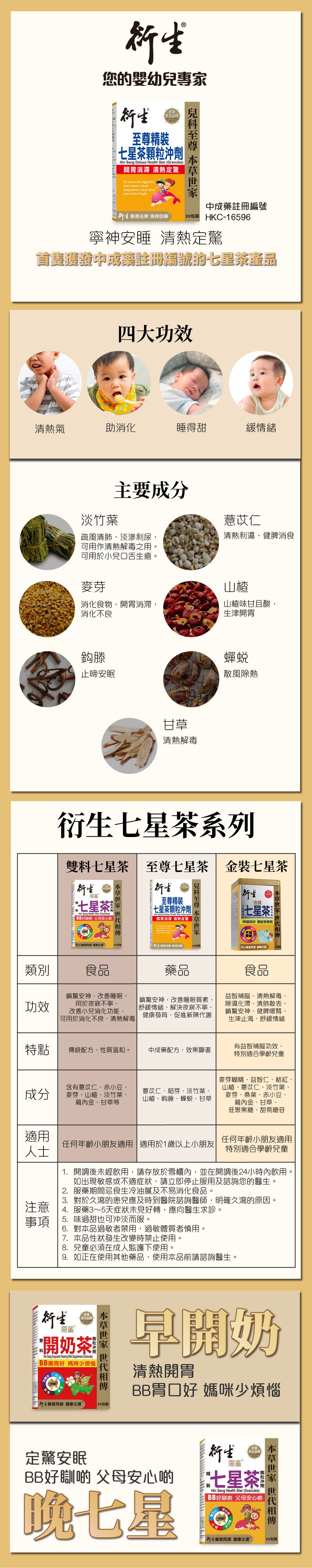 衍生至尊精裝七星茶顆粒沖劑為HKC註冊中成藥 ,選用國家藥典配方,含鈎藤、蟬蛻、山楂、稻芽等多種中藥成分 ,有助清除熱氣,平衡腸道健康,舒緩煩燥情緒,解決BB午夜驚醒或難以安睡等睡眠問題。