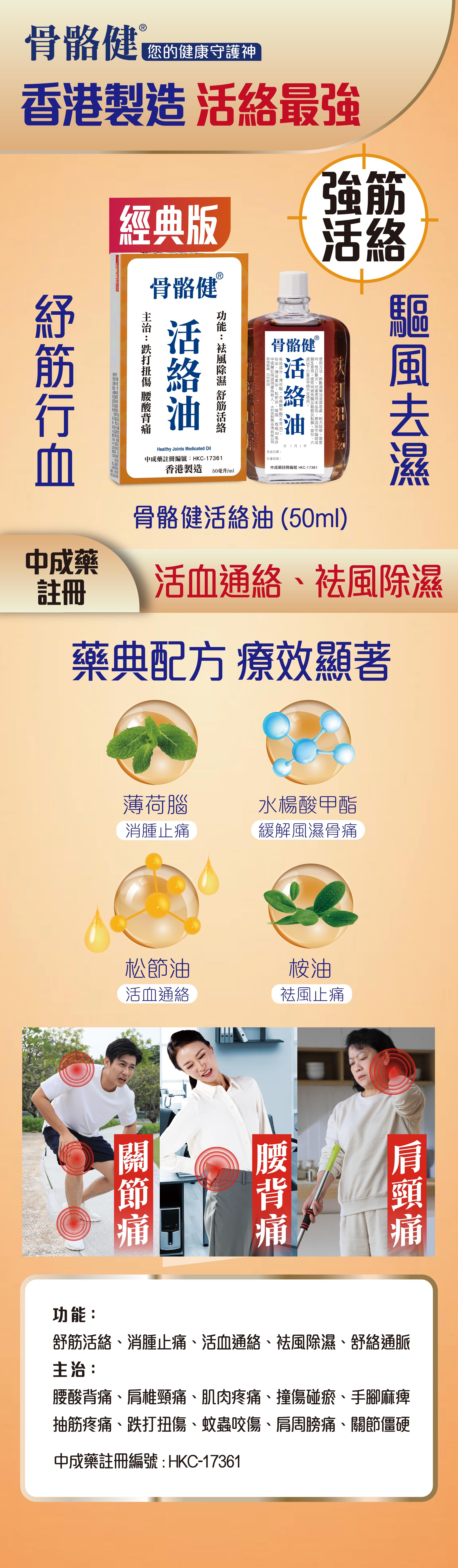 骨骼健活絡油 內含薄荷腦、樟腦、丁香油等成分精製而成,只需要將活絡油滴在患處,輕輕按摩,即有效舒筋活絡、祛風散瘀、消腫止痛、活血通絡!