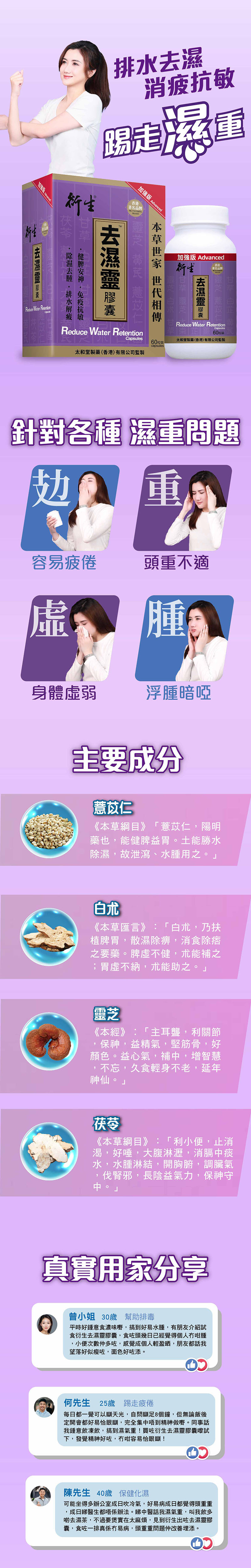 含茯苓、靈芝、白芷、黃芪、薏苡仁、大棗、白朮等草藥,能緩解身重,浮脹等徵狀,是幫助去濕,去浮脹的良方。另加入酸櫻桃濃縮粉、植物乳植杆菌 LM1004,有助增強免疫力及減輕濕敏症狀。