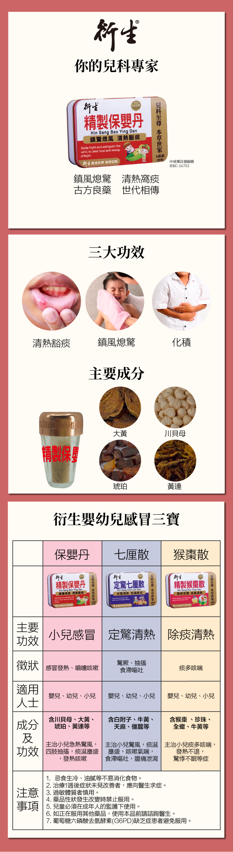 衍生精制保婴丹 可镇惊熄风,清热豁痰。由琥珀、川贝母、黄连、天麻等成分精制而成,加入体外培育牛黄,有效解决BB发热咳嗽及痰涎壅盛等问题。