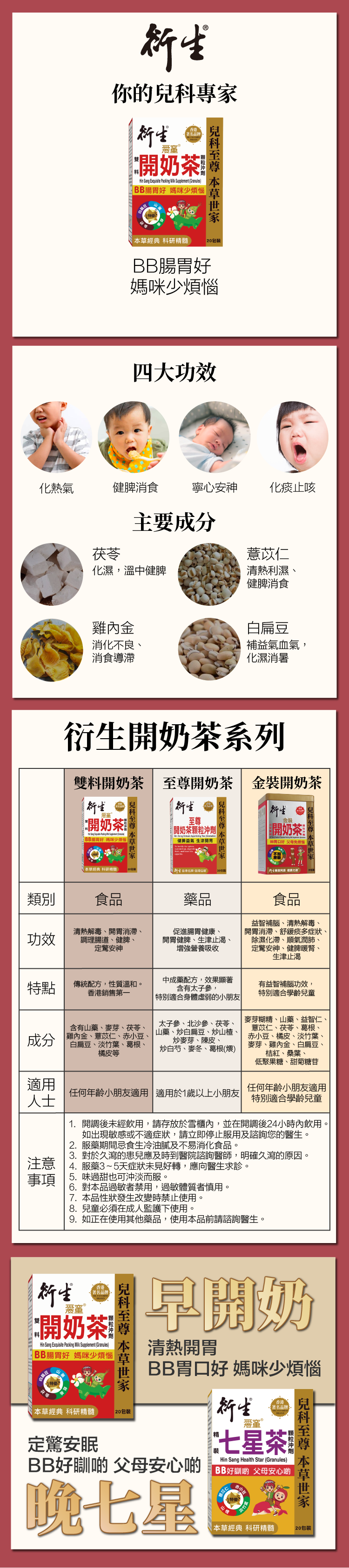 衍生双料开奶茶颗粒冲剂,精选药食同源的山药萃取物、麦芽萃取物、茯苓萃取物、鸡内金萃取物等成分。 BB肠胃好,妈咪少烦恼。