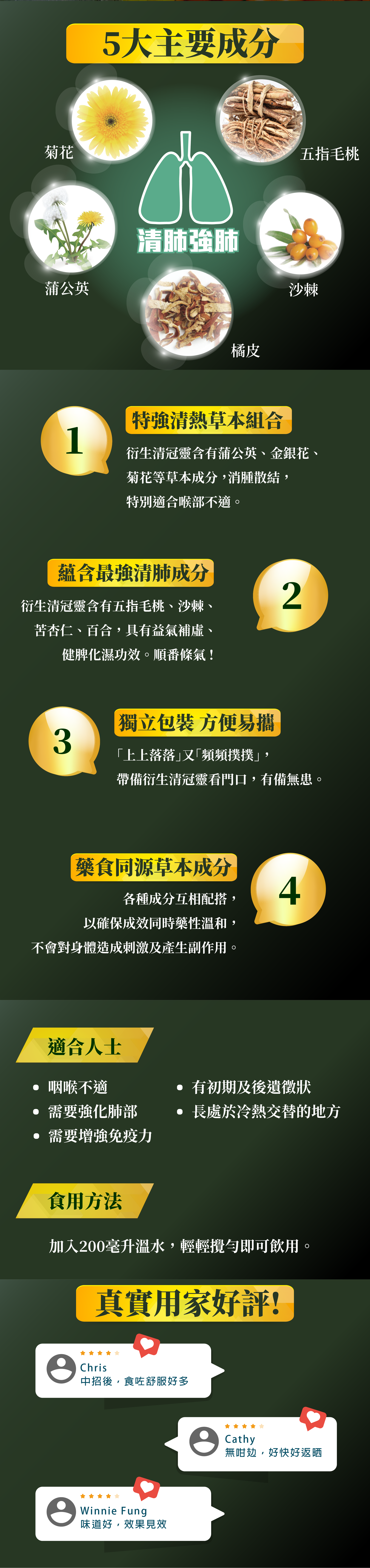 ✔ 特强清肺草本组合 五指毛桃、沙棘、苦杏仁、百合具有益气补虚、健脾化湿功效。咳嗽有痰时服用可舒缓不适!