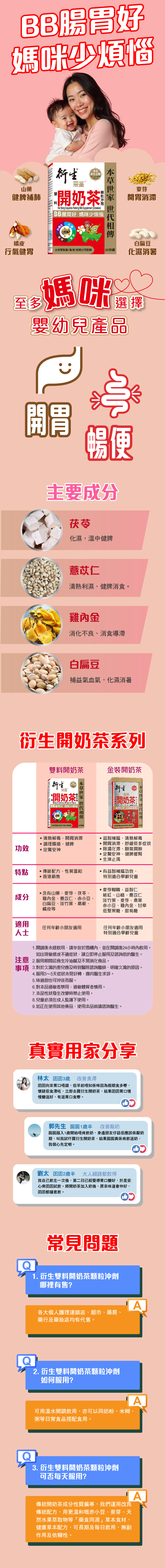 衍生雙料開奶茶顆粒沖劑,精選藥食同源的山藥萃取物、麥芽萃取物、茯苓萃取物、雞內金萃取物等成分。BB腸胃好,媽咪少煩惱。